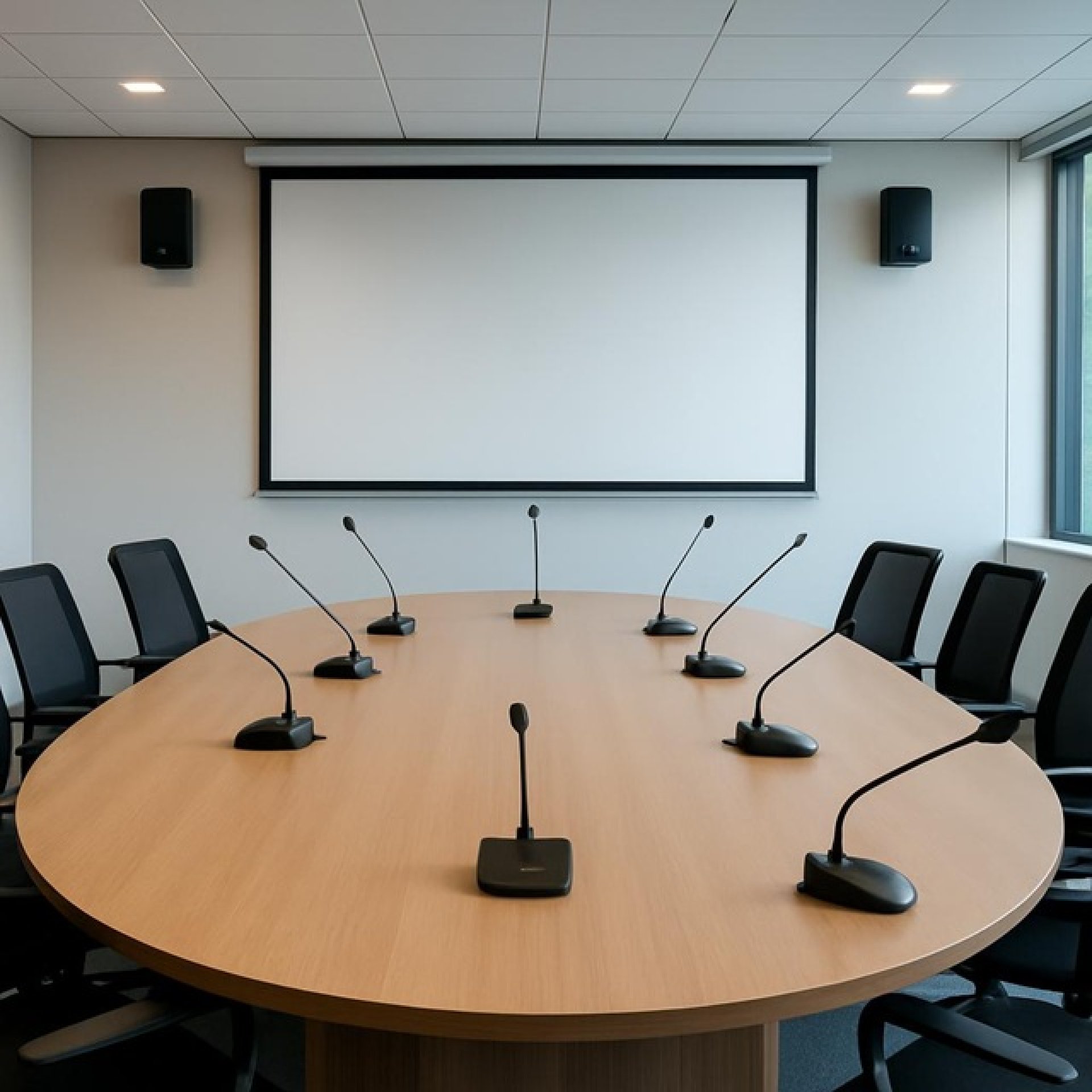 -ไมโครโฟน (Microphone): อุปกรณ์รับสัญญาณเสียง ควรเลือกชนิดให้เหมาะกับขนาดห้อง เช่น ไมโครโฟนตั้งโต๊ะสำหรับห้องขนาดเล็ก หรือไมโครโฟนไร้สาย/ติดเพดานสำหรับห้องขนาดใหญ่